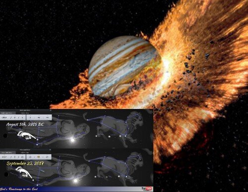 Эти небесные знаки, хотя и не ожидаемые никем, кроме тех, кто блокирует информацию от общественности и тех, кто исследует это, будут иметь катастрофические последствия для Земли. В Книге конкретно описывается столкновение между Красным Драконом, которого власть имущие пытаются скрыть от мира, и Юпитером. Это событие запланировано на 9 сентября 2017 года или вскоре после этой даты. А через две недели произойдет другое событие и оно изменит мир.