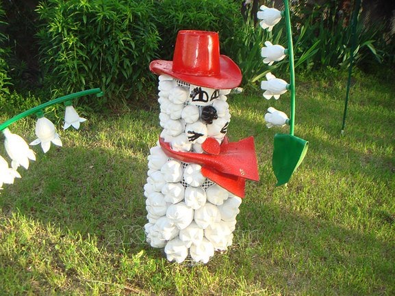 Это животное выполнено совершенно другим способом. Сначала нужно собрать много пластиковых бутылок объемом в 2 или 1,5 литра, примерно, 100 штук. Как сделать поделку для сада в виде кота пошагово: С каждой емкости нужно срезать донышко, именно эта часть бутылки и нужна для работы. Потом из металлической сетки надо сделать два шара: большой – туловище, маленький – голова. Они легко и надежно соединяются проволокой. Затем к сетке нужно прикрепить донышки бутылок. Это можно сделать при помощи тонкой проволоки или жидких гвоздей. Шляпа, галстук, язык и глаза сделаны из кусков старого линолеума. Остается только покрасить кота в белый цвет (можно и в любой другой). Нарисуйте ему глаза, нос и усы черной краской. А вот язык, головной убор и галстук разукрасьте в яркие оттенки красного. Чтобы конструкция прочно стояла, ее можно закрепить на металлическом пруте, вкопанном в землю.