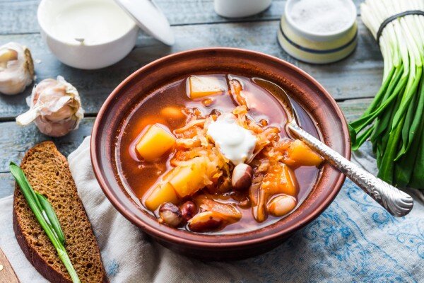 Ингредиенты: свиные ребра — 1 кг мозговая кость — 1 шт. морковь — 1 шт. картофель — 3-4 шт. фасоль — 1 стакан корень петрушки с зеленью — 1 шт. свекла — 1 шт. чеснок — 2-3 зубчика лук — 1 шт. сало — 100 г соль, перец — по вкусу лавровый лист — 2 шт. томатная паста — 2-3 ст.л. вода — 3 л Приготовление: Сварить из ребрышек, кости, лаврового листа и корня петрушки крепкий бульон. Убрать из бульона лавровый лист и петрушку. Добавить в бульон заранее замоченную фасоль. Довести до кипения и варить 15-20 минут на небольшом огне. Лук и морковь нарезать соломкой, обжарить и добавить в бульон вместе с раздавленными зубчиками чеснока. Варить 10-15 минут. Свеклу нарезать соломкой, пассеровать на сале и добавить в кастрюлю. Варить 5 минут. Затем добавить нарезанный кубиками картофель и нашинкованную капусту. Когда картофель будет готов, добавить томатную пасту. Варить еще 10 минут. Приправить и добавить в борщ нарезанную зелень. Подавать борщ со сметаной и черным хлебом. Приятного аппетита! 😉 П