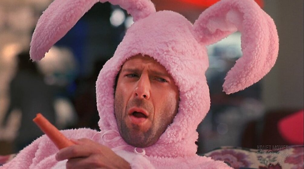 Комедия «Норт» вышла в 1994 году – как раз после двух «Крепких орешков», которые закрепили за Брюсом Уиллисом образ бравого полицейского. Но в «Норте», сценарий которого был предложен Уиллису чисто из азарта, повезет – не повезет, актер с удовольствием согласился на роль Пасхального кролика. В полном «боевом» снаряжении: розовый костюм, морковка и черный юмор.