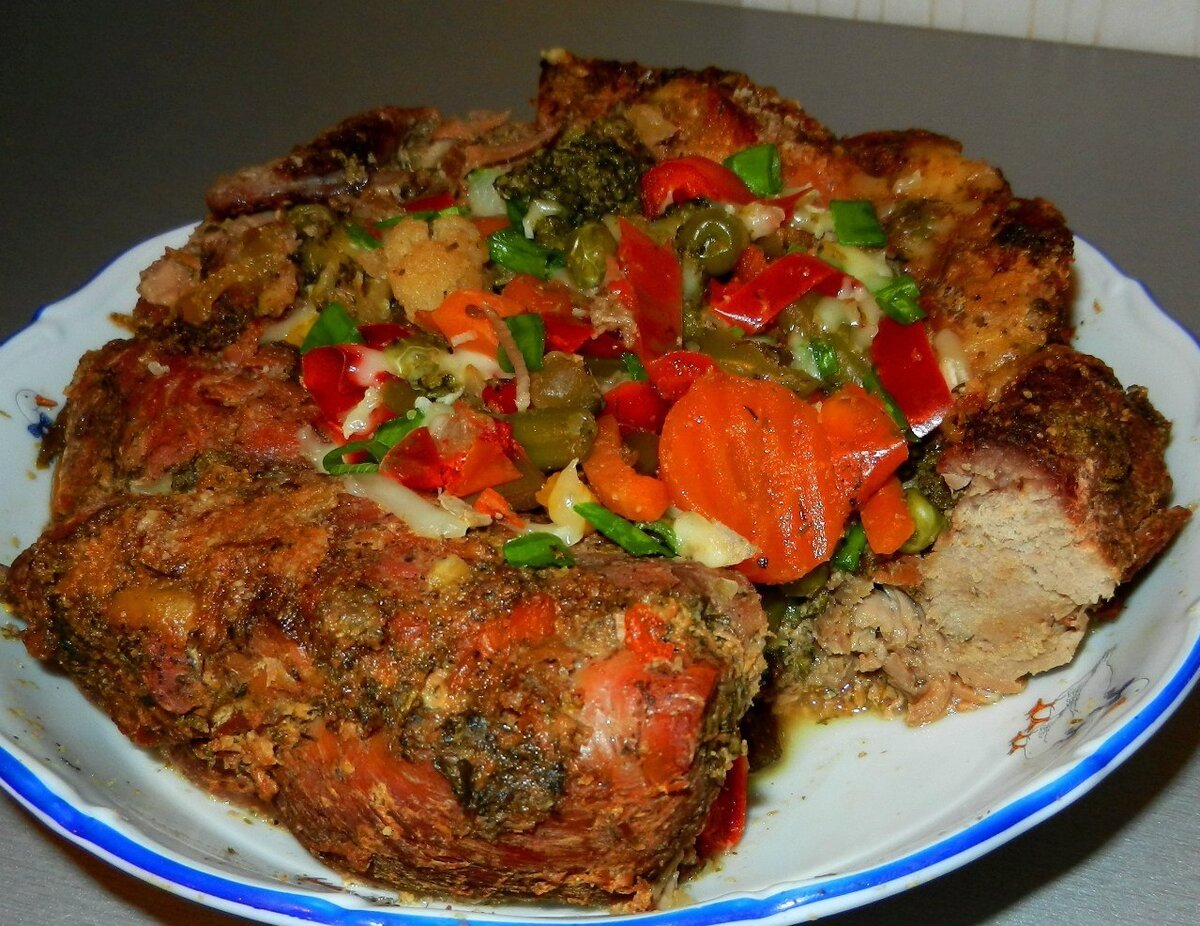 Свиную вырезку отбить, вдоль куска сделать 3 надреза (не до конца) и заплести косичку. У меня было 2 косички. Замариновать их в смеси меда, лимонного сока, «Кавказских» специй и йогурта на несколько часов (лучше на ночь). Выложить «косички» в форму для запекания в виде кольца, прикрыть фольгой и запечь при температуре 190 градусов 40-50 минут. Овощи смешать с солью, перцем, туда же добавить порезанный чеснок. Выложить в центр кольца овощную смесь и запекать всё вместе еще минут 30. За 10 минут до готовности присыпать овощи тертым сыром.