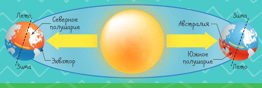 Мы с тобой живём в Северном «верхнем» полушарии, а Австралия находится в Южном – в нижней части Земли. Наша планета вращается вокруг Солнца и вокруг своей оси – это ты уже наверняка знаешь. Но знаешь ли ты, что Земля немного наклонена по отношению к Солнцу? Именно поэтому солнечные лучи освещают разные полушария по-разному. В одну часть года Северному полушарию достаётся всё тепло (а Южному, наоборот, лучей не хватает), во вторую же часть года – жарко в Южном, а холодно в Северном полушарии. Так что передаём привет зимующей сейчас Австралии!