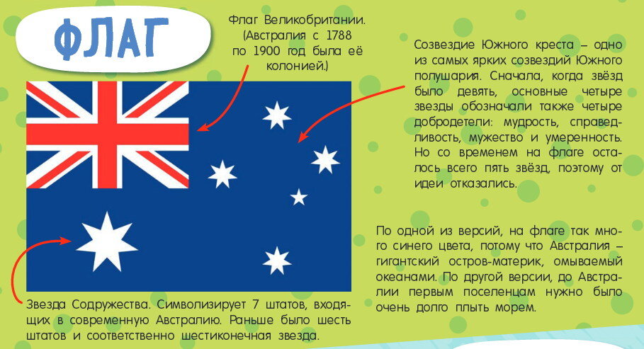 У каждой страны есть свои символы – герб и флаг, которые рассказывают с помощью изображений об особенностях страны. У Австралии они, конечно, тоже есть. И при этом очень необычные! Флаг Австралии Звезда Содружества. Символизирует 7 штатов, входящих в современную Австралию. Раньше было шесть штатов и соответственно шестиконечная звезда Флаг Великобритании. (Австралия с 1788по 1900 год была её колонией.) По одной из версий, на флаге так много синего цвета, потому что Австралия – гигантский остров-материк, омываемый океанами. По другой версии, до Австралии первым поселенцам нужно было очень долго плыть морем. Созвездие Южного креста – одно из самых ярких созвездий Южного полушария. Сначала, когда звёзд было девять, основные четыре звезды обозначали также четыре добродетели: мудрость, справедливость, мужество и умеренность. Но со временем на флаге осталось всего пять звёзд, поэтому от идеи отказались. Герб Австралии Снова Звезда Содружества, а под ней – гербы шести штатов: Новый Юж