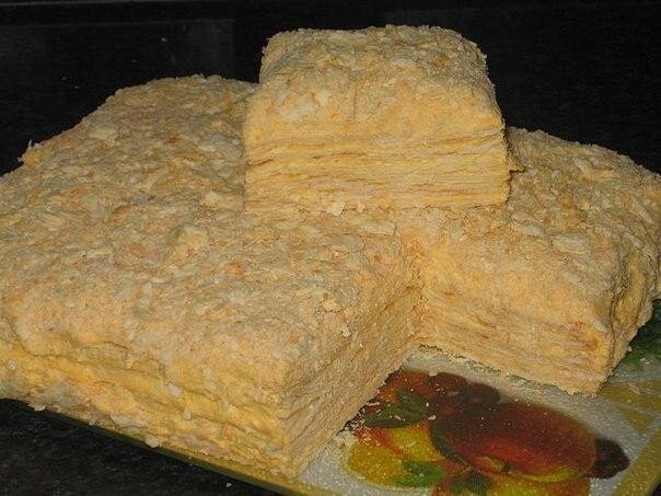 Ингредиенты: ТЕСТО 2 ст.муки, 200 гр сл. масла, 200 гр сметаны, щепотка соли. Я беру еще половину этой нормы всех продуктов - чтобы лишний корж был для обсыпки. КРЕМ - лучше всего сюда подходит заварной крем - нежный и не жирный. Приготовление: На доску насыпать муку, положить охлажденное масло нарезанное маленькими кусочками и все это мелко порубить ножом. После этого в муке сделать углубление и влить сметану, чуть чуть посолить и замешать тесто. Из теста скатать шар и убрать в холодильник на несколько часов. Перед выпечкой раскатать и сложить, еще раз раскатать и сложить в 2-3 раза. ВСЁ - наше тесто готово. Разделить примерно на 4-5-6 коржей (как получится) и выпекать в духовке 180 гр. минут 30. Пока пекутся коржи, сделать крем 1/2 л молока, 1 стакан холодного молока, 2-3 ст.ложки муки, 2 яйца, 1,5 стакана сахара, 150 г слив.масла, ванилин. Яйца взбить с сахаром, добавить 1 стакан холодного молока и муку, взбить. Влить эту массу в кипящие 1/2 л молока. Варить до загустения, пос
