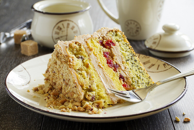 Ничего не может быть вкуснее "забытого, старого, проверенного годами" торта. И если уж совсем по-чесноку, мои дети с бОльшим удовольствием и бОльшей скоростью съедают такие простые, испытанные торты, как Медовик, Панчо, Пражский, Наполеон и так называемый Стаканник. Этот рецепт у меня появился еще лет 10-15 назад. Периодически к нему возвращаюсь, чтоб порадовать своих мужчин. Довольно калорийный, из-за масляно-сгущенного крема, орехов, сухофруктов. Но что может быть лучше, чем чашечка чая с кусочком такого тортика, сидя в любимом кресле. Тесто: - 1 ст сахара, - 1 ст муки, - 1 ст сметаны, - 5 яиц, - 2 ст л растопленного сливочного масла, - 1 ч л разрыхлителя. - 1 ст мака (можно 0,5), - 1 ст рубленного фундука (можно 0,5), - 1 ст сушеной вишни или клюквы (можно 0,5). дополнительно стакан обажаренного и рубленного фундука для обсыпки. Крем: - 1 б вареной сгущенки, - 300 г сливочного масла. Приготовление: Взбить яйца с сахаром, добавить сметану и сливочное масло. Осторожно вмешать прос