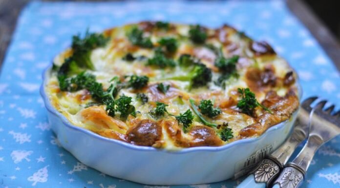 Запеканка из лосося, брокколи и спаржи в сливочном соусе