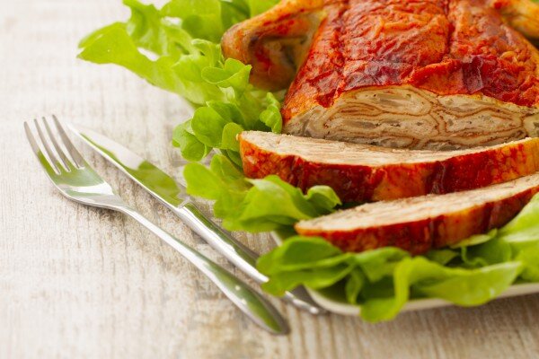 Ингредиенты: тушка курицы — 1.5 кг блины — 6 шт. лук — 1 шт. шампиньоны — 200 г яйцо — 1 шт. сыр — 100 г растительное масло — 50 мл сметана — 100 г чеснок — 1 долька соль, свежемолотый перец — по вкусу Приготовление: Куриную тушку помыть и обсушить. Положить грудкой вверх и острым ножом аккуратно отделить кожу. Перевернуть курицу и удалить гузку. Подрезать жировые прослойки на спинке, отделяя кожу от мяса. Ножки освободить от кожи, надломить и подрезать по суставам. Так же по суставам подрезать крылышки. Ножки заправить внутрь. Снять куриную кожу как чулок, натереть солью и свежемолотым перцем. Поставить в холодильник, пока готовится начинка. Куриное мясо отделить от костей и измельчить с помощью блендера или в мясорубке. Очищенный лук и грибы мелко нарезать и обжарить на растительном масле. Посолить и поперчить, дать немного остыть. Добавить к куриному фаршу вместе с яйцом. Еще раз посолить и поперчить. Приготовить тонкие блины на молоке. На один блин намазать часть начинки, сверну