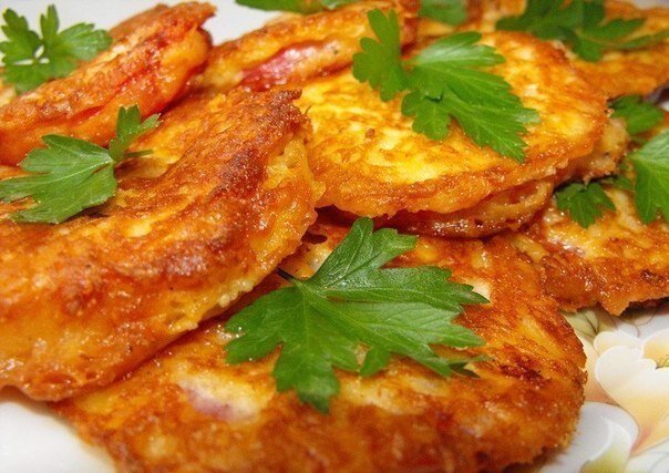 Ингредиенты: -3 средних помидора -150 гр твердого сыра -2 яйца -2 ст.л. майонеза или сметаны -1-2 ст.л. муки -соль, перец по вкусу -растительное масло для жарки -петрушка для украшения Способ приготовления: Помидоры помыть, обдать кипятком, снять кожицу и нарезать кружочками. Сыр натереть на мелкой терке. Сделать кляр: к сыру добавить яйца, майонез, муку. Посолить, поперчить по вкусу и перемешать. Консистенция дожна получиться густой. Помидоры обмакнуть в кляр, выложить ложкой в сковороду, разогретую с растительным маслом. Обжарить с двух сторон до золотистой корочки. Выложить на бумажное полотенце, дать стечь лишней жидкости. При подаче украсить зеленью петрушки.