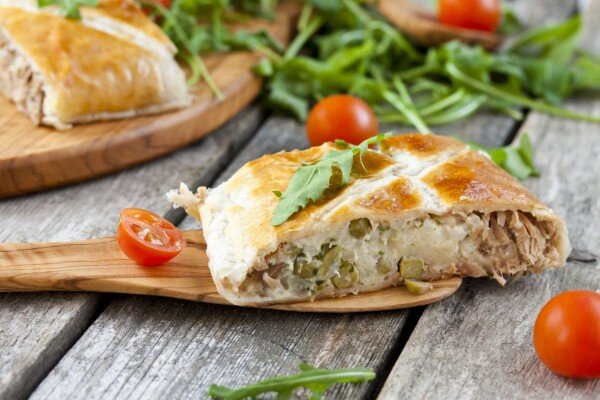 Вкусный, сытный рыбный пирог. В холодном виде он даже вкуснее, поэтому станет очень удобным вариантом для пикника. Ингредиенты: слоеное тесто- 1 пласт рис — 1/8 стакана вода — 1/2 стакана сливочное масло — 30 г мука — 1 ст.л. рубленая зелень — 1 ст.л. молоко- 1/2 стакана яйцо — 1 шт. зеленый горошек- 1/3 стакана консервированный тунец — 1 банка вареные яйца — 2 шт. яйцо или молоко — для смазывания соль — щепотка Приготовление: Разогреть духовку до 180 С. Застелить противень для выпечки пергаментной бумагой. Слоеное тесто разморозить. Отварить рис в подсоленной воде. Растопить в сотейнике сливочное масло, добавить муку и обжарить до золотистого цвета. Помешивая, влить молоко и варить около 1 минуты. Остудить, смешать с яйцом, рубленой зеленью и горошком. Выложить пласт теста на рабочую поверхность. Вилкой размять рыбу и равномерно распределить на тесте, оставляя несколько сантиметров от края со всех сторон. Сверху уложить четвертинки вареных яиц. Перемешать рис и соус с горошком,