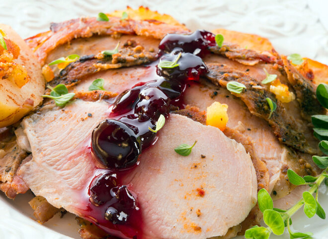 Предлагаем вам на этот раз попробовать интересный вариант запеченной в духовке индейки, нафаршированной исключительно фруктами – это очень вкусно, хотя и не совсем обычно. И помимо фруктовой начинки, мы подадим индейку на стол под сладко-пьяным ягодным соусом. Ингредиенты: 1 индейка (4-5 кг), 1 кг яблок, 0,5 кг груш, 0,5 кг айвы, 1 лимон, зелень (петрушка, розмарин), 4 ст. ложки растительного масла, 2 ч. ложки прованских трав, черный молотый перец по вкусу, соль по вкусу. для соуса: 200 г вишни (варенье или компот), 100 мл красного сухого вина, 1 ст. ложка муки, сахар по вкусу, 10 г ванильного сахара, 1 бутон гвоздики, 1 горошина душистого перца, щепотка кориандра, черный молотый перец по вкусу. Приготовление: Тушку индейки очистить от остатков перьев, помыть и обсушить полотенцем. Тщательно натереть ее снаружи и внутри солью и пряностями и оставить на 1 час. Подготовить фрукты. Яблоки, айву и грушу чистить от сердцевинок и хвостиков и порезать ломтиками. Лимон очистить от кожуры
