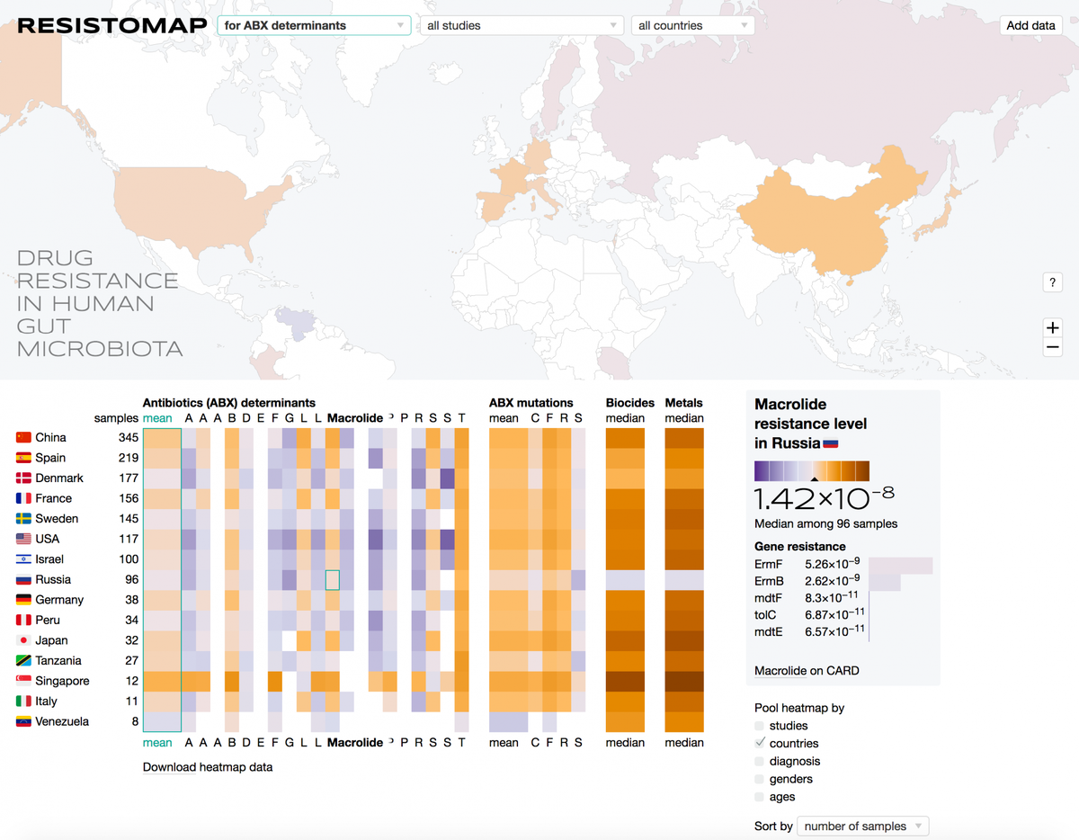 Интерактивная карта, доступная по ссылке, позволяет анализировать обусловленные географией особенности устойчивости бактерий к антибиотикам. Это, как отмечают компетентные эксперты, довольно серьезная проблема для мировой медицины — все больше бактерий становятся нечувствительными к существующим антибиотическим препаратам, что создает глобальную угрозу для человечества.
