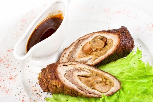 Фаршированный куриный рулет – универсальное блюдо. Ароматные бутерброды на завтрак, холодная закуска на обед, пикантное горячее на ужин – лишь несколько вариантов его подачи. Ингредиенты: очищенный и нарезанный лук-шалот — 1 стакан полоски бекона — 225 г куриное филе без кожи- 4 шт. соль, перец — по вкусу лимонная цедра — по вкусу тертый пармезан — 30 г оливковое масло — 1 ст.л. измельченный чеснок — 1 ч.л. сухое белое вино — 1/3 стакана сливочное масло — 2 ст.л. мука — 1,5ст.л. куриный бульон — 1 1/4 стакан жирные сливки — 1/4 стакана Приготовление: Партиями обжарить бекон на сковороде, переложить в тарелку. Уменьшить огонь до минимума и добавить лук-шалот в сковороду с вытопившимся жиром. Готовить до мягкости и переложить лук шумовкой в миску. Поместить куриные грудки между двумя листами полиэтиленовой пленки и отбить. Посыпать солью, молотым перцем и лимонной цедрой. Поместить по 2-3 ломтика бекона в центре каждой куриной грудки, продольно. Посыпать луком и тертым пармезаном. Св