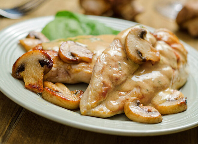 Представляем вам очередной заманчивый рецепт куриного филе. Попробуйте приготовить курицу с грибами, но не запеченную традиционно в духовке, а обжаренную в виде отбивных на сковороде. Ингредиенты: 500 г куриного филе, 4 яйца, 200 г шампиньонов, 2 зубка чеснока, 0,5 лимона, 3-4 ст. ложки муки, 100 мл майонеза, 2 ст. ложки растительного масла, щепотка молотой паприки, щепотка молотого кориандра, черный молотый перец по вкусу, соль по вкусу. Приготовление: Шампиньоны почистить и порезать тонкими пластинками. Чеснок пропустить через чесночницу. Из лимона выдавить сок. Приготовить соус для курицы с грибами. Для этого смешать майонез, чеснок, лимонный сок, специи и соль. Куриное филе порезать на тонкие пласты. Хорошенько отбить, перемазать с обеих сторон соусом, сложить стопочкой и оставить мариноваться на 20 минут. Взбить венчиком яйца, смешать с 1 ст. ложкой воды, солью, перцем и снова хорошенько перемешать. В другую посудину насыпать муку. Поочередно обмакивать куриное филе в муку, за
