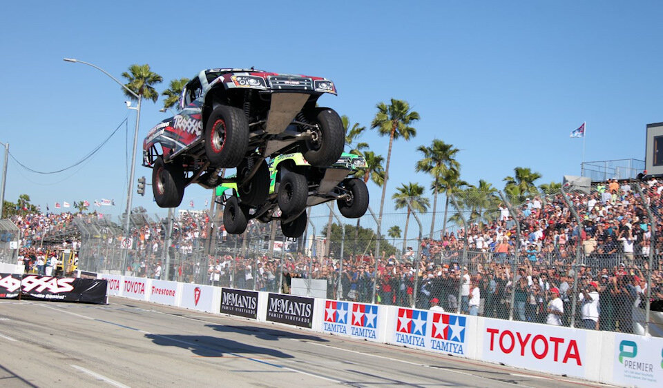 Гонка скоростных вездеходов проводилась на городской асфальтированной трассе в Лонг-Бич, той же, где проводятся гонки серии Инди! И вот такое зрелище публике пришлось по вкусу. Ревущий грузовик на огромных колёсах, с высоченным центром тяжести входит, визжа резиной, в поворот, подвеска сильно разжата, оттого поворот преодолевается с сильным креном на трёх колёсах. А за поворотом обычно ждёт искусственное препятствие в виде серии трамплинов, на которые этот исполин влетает на скорости около 120 км/ч.