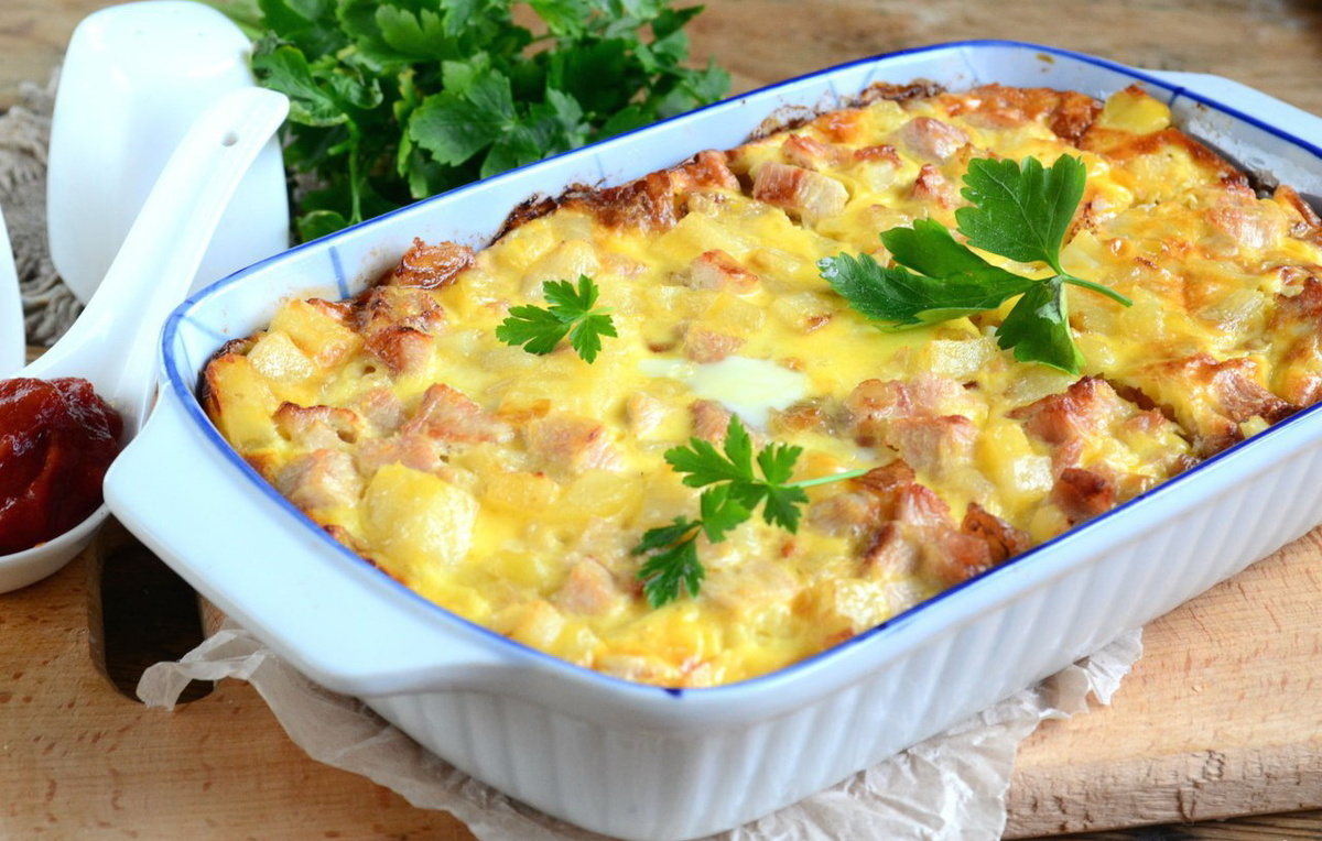 Быструю картофельную запеканку я готовлю очень часто. Основой ее является отварной картофель и отварное мясо. Вместо мяса можно использовать и колбасу, но с мясом запеканка получается все же вкуснее. Блюдо готовится очень быстро, особенно, если картофель и мясо отварить заранее. Кроме этих двух ингредиентов можно также добавить лук-порей, морковь, цветную капусту и другие овощи. 🍴Ингредиенты: Картофель — 400 Грамм Грудка индейки — 300 Грамм Яйца — 3 Штуки Майонез — 2 Ст. ложки Соль, перец — По вкусу Количество порций: 3-4 🍴Как приготовить "Быстрая запеканка (проще простого)" 1. Подготовьте все необходимые ингредиенты. Картофель отварите в кожуре до готовности (около 25 мин.). Грудки индейки отварите в подсоленной воде 20-25 2. Грудки порежьте мелким кубиком. 3. Кубиком такого же размера порежьте картофель, который предварительно очистите. 4. Обжарьте картофель вместе с грудкой на сковороде до легкой румяной корочки. Это придаст запеканке дополнительной хрусткости. 5. Яйца взбейте
