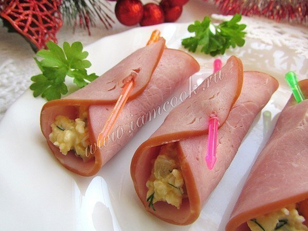 Рулетики из ветчины, сыра, яиц и маринованного огурца - вкусная и сытная закуска для праздничного стола. Нотку пикантности закуске придадут щепотка черного молотого перца и пара зубчиков чеснока. Перед подачей на стол закуску следует охладить.
