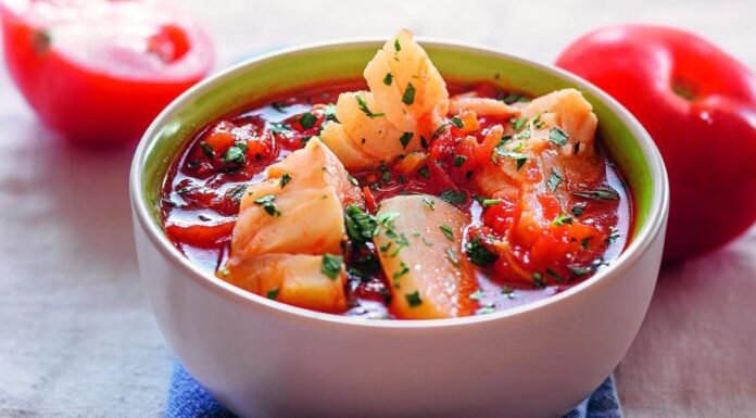 - Разложить потарелкам картофель и кусочки рыбы, полить томатным бульоном и посыпать петрушкой.