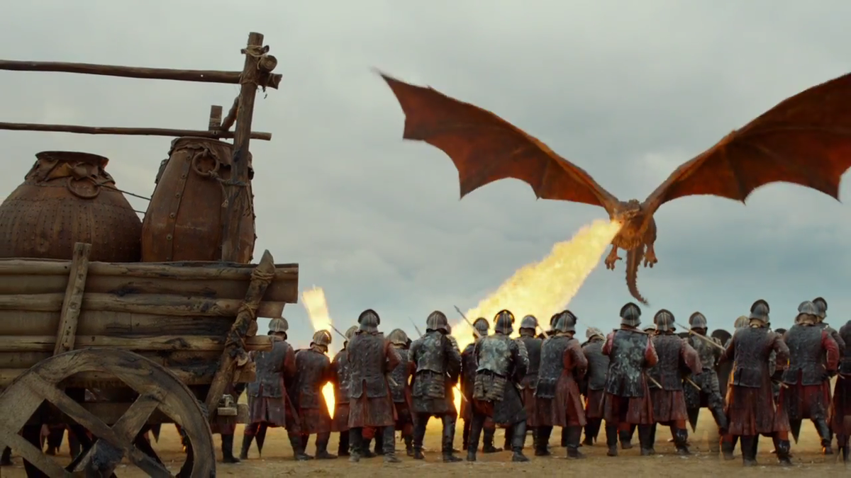 Это круче Битвы бастардов. В 4 эпизоде 7 сезона «Игры престолов» Дейенерис и Ланнистеры сразились за награбленные сокровища Тиреллов. Технически сцена сложная, так как массовка "сражалась" с вымышленным драконом, но горела по-настоящему.