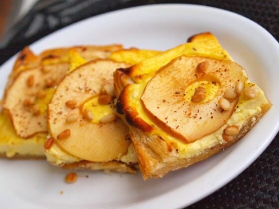 - Яблоки вымыть и, удалив специальным ножом сердцевину, нарезать тонкими кольцами. Слоеный корж промазать творожной массой, сверху выложить яблоки. Посыпать корицей.