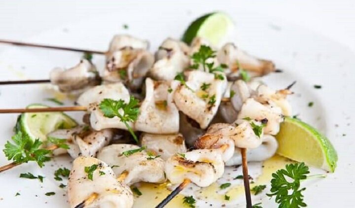 Готовим вкуснейший шашлык из кальмаров на 4-х человек, калорийность составляет 117 кКал. Необходимые ингредиенты: - филе кальмара – 500 грамм; - лимон или лайм – 1 шт.; - лук зелёный – 1 пучок. Для маринада: - масло растительное – 1 ст. ложка; - перец чили измельчённый – 2 ч. ложки; - зелень мяты или кинзы рубленой – 2 ст. ложки; - винный уксус – 3 ст. ложки; o сахар – 1 ст. ложка Способ приготовления: Смешать масло с чили, кинзой или мятой, сахаром и уксусом. Очищенные кальмары нарезать кусочками по 1,5-2 см и мариновать 1,5 часа в приготовленной смеси. Нанизать кальмары на шампуры и готовить на гриле 3 – 4 минуты, постоянно поворачивая, но не пережарить, так как кальмары станут жёсткими. Подавать кальмары со слегка подпечённым зелёным луком и дольками лимона или лайма. Отдельно подать прогретый маринад. Время приготовления: 15 мин. + маринование. ПРИЯТНОГО АППЕТИТА!