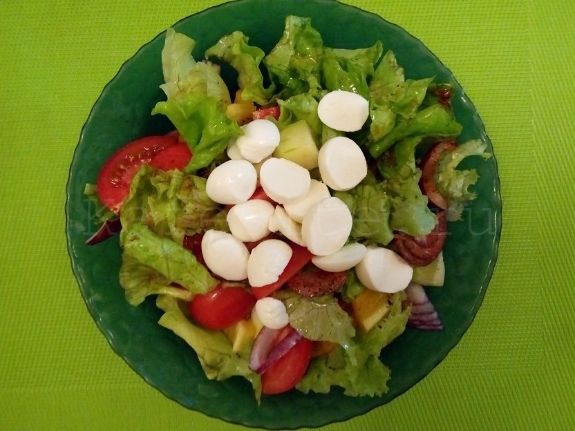Салат с моцареллой и помидорами - прекрасный овощной рецепт. Весна стучится в двери. С первым весенним теплом и первыми цветами нам хочется ощутить легкость, воздушность, грациозность. А вот походы к зеркалу после зимних дней иногда разочаровывают. Все чаще мы задаемся вопросом: «Что приготовить на ужин вкусное и легкое одновременно?». Будем готовить салат с моцареллой и помидорами. Набор продуктов простой и доступный круглый год, время приготовления – 10 минут, сочетание белков, жиров и углеводов – идеальное, калорийность – минимальная. Приступаем. Ингредиенты Листовой салат – 4-5 листков. Огурец – 1 шт. Перец болгарский – 1/3 большого перца. Помидоры коктейльные(черри) – 4-5 шт. Лук красный – 1/2 головки. Моцарелла – 4-5 головок. Масло оливковое – 1 ст. л. Соль, перец, паприка – по вкусу. Приготовление Огурец делим вдоль на четыре части и затем нарезаем кубиками. Нам попался огурец с горькой шкуркой, её пришлось обрезать. Болгарский перец, очищенный от семян, нарезаем кубиками. П