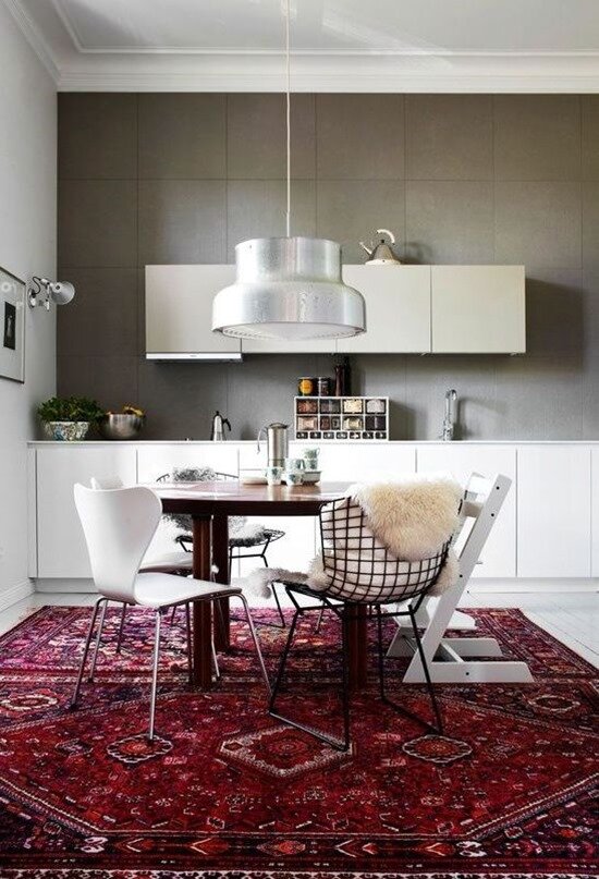 В нашей стране мода на ковры пришла и исчезла вместе с советской эпохой, надолго оставив оскомину от этого ворсистого атрибута домашнего уюта. Однако во всем остальном мире ковер был и остался лишь элементом декора, не привязанным к политическим реалиям. Поэтому в современных интерьерах Европы и Америки можно встретить восточные ковры в самых неожиданных для нас сочетаниях. Сегодня наша статья именно об этом. Прежде чем вы решите купить ковер в интернет магазине, вероятно, вам будет интересно увидеть, как дизайнеры всего мира используют это напольное покрытие в своих проектах. В качестве примера мы взяли ковры с восточным орнаментом, так как они кажутся наиболее выразительными, в сравнении со своими однотонными собратьями. Сегодня эклектика, пожалуй, популярна как никогда: границы стилей не то чтобы стираются, а будто пересекаются в одном интерьере. Поэтому узорчатые восточные ковры в равной степени можно встретить и в кухне в стиле кантри, и в минималистичной городской гостиной. При э