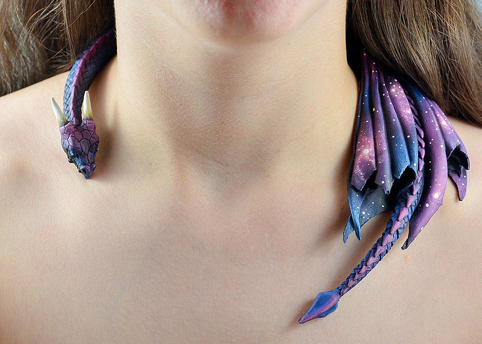 Нам особенно нравятся ожерелья. Они сделаны как воротник из двух частей, выглядит так, будто ваш собственный дракон расположился отдохнуть на вашей шее.