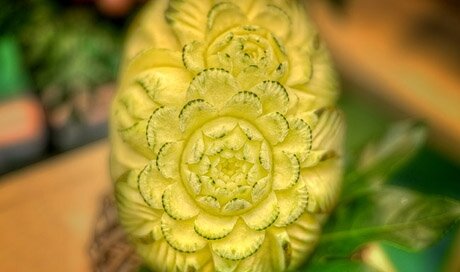 Этот вид необычного рукоделия возник в древности на Востоке. За тысячи лет фигурная нарезка овощей и фруктов стала неотъемлемой частью традиции многих стран. Настоящий карвинг требует от мастера большой искусности, его отличает сложность резьбы и невероятная изысканность. Однако в Европе сегодня им увлекаются не только профессионалы, но и любители. Европейский стиль отличается простотой, что привлекает множество людей. Научиться нескольким нехитрым приемам вырезания художественных форм может любой. Главное - наличие желания, свободного времени и специальных инструментов. Многие увлекаются этим необычным рукоделием, чтобы тренировать свою фантазию и заодно удивлять гостей оригинальной сервировкой стола. Очень популярен карвинг среди детей. Если вы научите их вырезать овощи и фрукты, то со временем они смогут не только украшать стол к обеду, но и готовить красивые блюда.