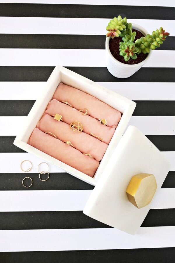 Как и где вы обычно храните кольца? У меня они хранятся в небольшой шкатулочке навалом. Когда колечек мало, то выбрать нужное просто, а когда их много? Конечно, есть специальные подставки для колец, но сегодня предлагаю мастер-класс как из любой коробки или ящичка сделать удобную шкатулку, в которой все кольца будут как на витрине. Мы будем делать не саму шкатулку, а её начинку. Итак, для того работы понадобится: Количество ткани зависит от размера коробочки и рулонов, которые туда поместятся. Шкатулка для колец своими руками: ход работы ⇒ Шаг 1. Сложите ватин вдвое и разрежьте на полосы шириной с вашу коробку + 0,5 см. Прикиньте, сколько понадобиться рулонов из ватина и какого диаметра. Смысл в том, что рулоны должны плотно лежать в контейнере, полностью заполняя его и по длине, и по ширине. Исходя из этого сворачивайте ватин, закрепляя рулоны булавкой, и примеряйте их в коробке. ⇒ Шаг 2. Возьмите ткань и вырежьте полоски по размеру рулонов с припуском по 2 см по длине и ширине. Сл