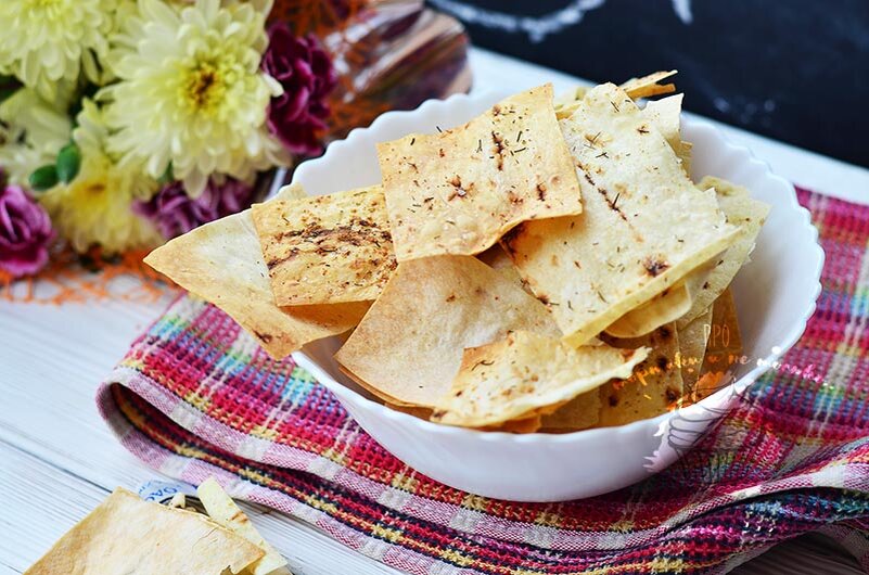 Отличная альтернатива вредным магазинным чипсам. Готовить их легко и просто, а получается вкусно и очень пряно!!! Продукты: Приготовление: 1. Налейте в миску или чашку 4 столовые ложки растительного масла. Это может быть оливковое или подсолнечное масло без запаха. Добавьте туда сушеный чеснок. Если нет сушеного чеснока, то можно взять свежий и очень мелко порубить его ножом. Но иногда свежий чеснок меняет свой цвет при температуре и приобретает зеленоватый оттенок. Также добавьте в миску любые специи. Это может быть паприка, если вы хотите красноватый цвет чипсов. Можно добавить куркуму для желтого цвета. А можно всыпать смесь специй. По желанию можно добавить сушеную зелень. Например, укроп или петрушку. Когда все ингредиенты добавлены в миску, хорошенько перемешайте полученную смесь. 2. Расстелите на большой ровной поверхности лаваш. Если в упаковке большие листы, то удобно разрезать их на более мелкие. Каждый лист лаваша промажьте маслом и специями с помощью кулинарной кисточк