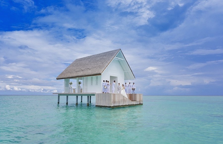 На Мальдивах открылся свадебный павильон-часовня, расположенный в акватории Индийского океана. Курортный отель Four Seasons на острове Landaa Giraavaru, Мальдивы, предлагает молодоженам совершить процедуру бракосочетания в свадебном павильоне, расположенном прямо посреди моря, в акватории Индийского океана. Белоснежное здание, возвышающееся над водой, имеет площадь 45 кв. метров и напоминает небольшую часовенку. Поднявшись по деревянным ступеням, молодожены и их гости попадут в белый зал с открытыми панорамными окнами. Здесь жениха и невесту встретят слуги, а на фоне моря они смогут прочитать друг другу свои клятвы. Интерьер павильона создан в полной гармонии с окружающей красотой и бирюзовой водой. Гости могут рассесться вдоль прозрачного пола, через который можно любоваться рыбами и морскими черепахами. Всего свадебный павильон рассчитан на 18 человек. Стоит он на нескольких сваях в нескольких десятках метров от берега. Доплыть до него можно только на гондоле.