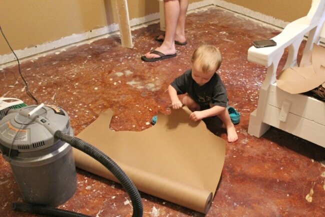 Ремонт в доме всегда бьет по карману. Но даже если вы решили сократить расходы, вовсе не обязательно выбирать самые бюджетные и скучные варианты. Кое-что можно сделать и своими руками из дешевых и доступных материалов. Причем результат может быть просто потрясающим. Кажется, что пол в доме этой хозяйки сделан из искусственного камня. Но на самом деле она сделала его сама. Из бумаги! Для этого вам понадобится: Итак: Этот трюк подойдет для пола с бетонным, штукатурным или фанерным базовым слоем. Сначала нужно снять старое покрытие и очистить пол до основания. Убедитесь, что не осталось ни следа клея, избавьтесь от плинтусов. Если на полу есть углубления или неровности, их нужно заделать. Чтобы бумага лучше прилипала, пол не должен быть слишком гладким, поэтому сначала можно пройтись по нему шлифовальным станком. Теперь порвите бумагу на большие неровные куски и слегка помните — так они будут больше похожи на натуральные камни. Если у вашего пола бетонная основа, приготовьте смесь из кле