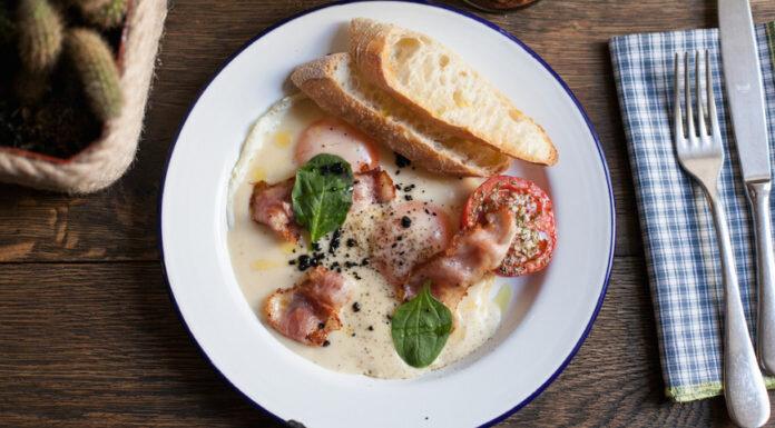 - Выложить на тарелку яичницу, полить сырным соусом, сверху положить бекон. На край тарелки положить помидор и чиабатту. Украсить мини-шпинатом и черным свежемолотым перцем.