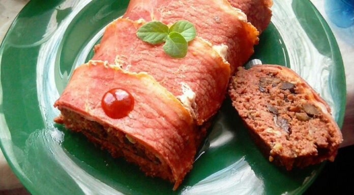 - Форму смазать оливковый маслом и выстелить сырокопченой свининой, затем плотно выложить нашу массу, обернуть все фольгой и отправиить в духовку при температуре 180 градусов на 70 минут.