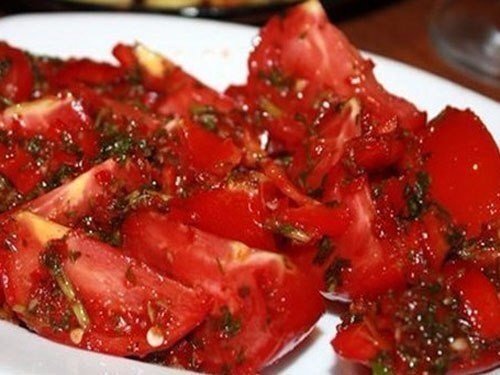 3. Укладывать слоями в 3-х литровую банку: помидоры, затем смесь из овощей, зелень.