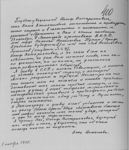 А.А. АХМАТОВА — И.В. СТАЛИНУ