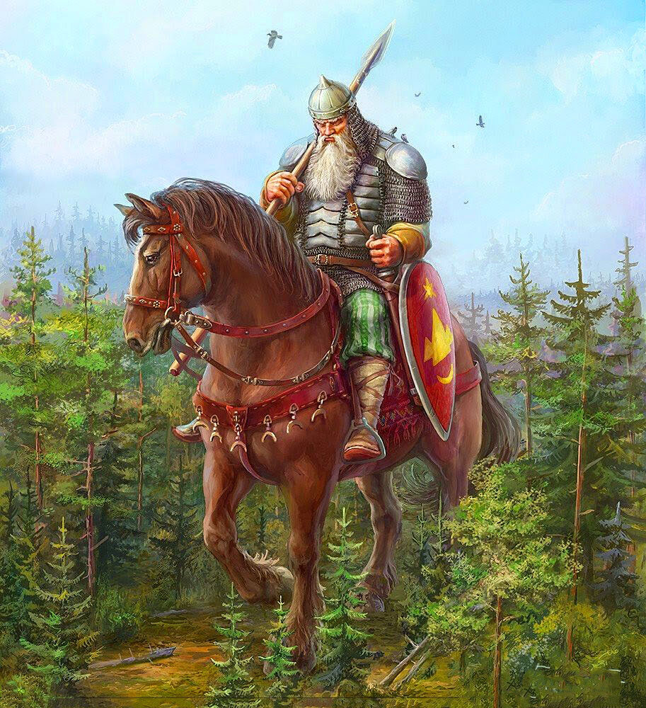 Попрощался богатырь Доброслав с родителями своими. Любаву,невесту свою ненаглядную поцеловал и отправился на службу царскую. Дорога к столице русской из той деревни одна была. Через лес тропа лесная. Пешком пошёл Доброслав, мог бы и коня найти. Да только ни один конь из тех что в деревне были,не смог бы богатыря такого на своей спине вынести. Не богатырские кони в деревне той были. Вот и шёл богатырь Доброслав пешком. Шел не унывал, да песню молодецкую напевал. А в песне своей он пел о том,что так дорого ему. О любви своей пел, о своих родителях, да о русской земле-матушке. Вдруг перед ним огромный волк появился. Не дрогнул Доброслав перед волком этим. А только лук со стрелами приготовил.Тут волк обернулся колдуном лесным и молвил: -Ну что богатырь, в дальний путь собрался? На царскую службу Родине своей послужить? Доброе и почётное это дело, землю русскую защищать. Только долго тебе идти придётся. Дорога дальняя перед тобой. Так при в дар от меня, коня богатырского. И как только сказал это лесной колдун.Так предстал перед ними чудо-конь невиданный. Богатырский конь. -Только это ещё не всё-сказал колдун. А ну-ка покажи свою силу богатырскую. Вот дуб стоит тысяча лет ему. Попробуй подними его. Подошёл Доброслав к тому дубу и легко поднял его вместе с корнями над землёй. А под корнями оружие богатырское лежало. Кольчуга из стали непробиваемой выкована. Шлем,щит и меч богатырские тут же лежали. Взял всё это оружие Доброслав. Дуб тот на место поставил. А как поставил он дуб тот,так снова корни этого дуба,с землёй и срослись. Поблагодарил Доброслав за эти дары лесного колдуна от всего сердца А колдун ему и говорит: -Беда великая может случится. И придётся тебе с войсками вражескими биться. Так вот возьми с собой горсть земли русской. Придёт время и земля наша поможет тебе в делах твоих славных. Взял богатырь горсть земли русской в платочек завернул. С лесным колдуном простился и в путь дорогу на коне богатырском верхом поехал.