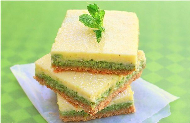 5. В том же блендере измельчите мяту и цедру лайма. Добавьте половину лимонной смеси. И выложите эту массу на уже запеченный корж. По желанию можете добавить зеленый пищевой краситель.