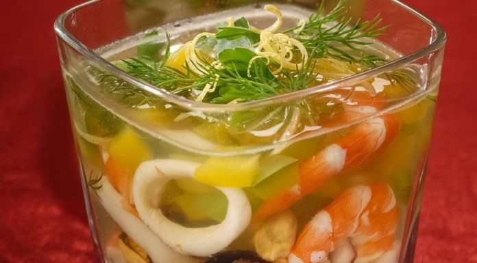 - Разложить по высоким бокалам коктейль, кубики перцев, лимонную цедру и зелень. Влить куриный бульон, дать остыть до комнатной температуры, затем поставить в холодильник до полного застывания.