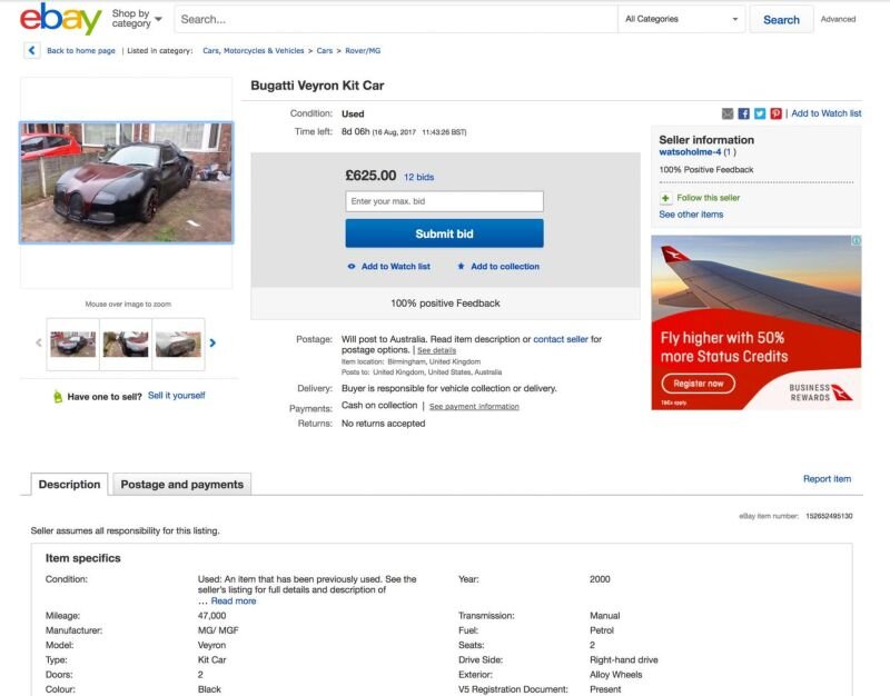 На eBay был выставлен гиперкар Bugatti Veyron. За "автомобиль десятилетия" просили всего 1000 долларов, а не несколько миллионов баксов. При ближайшем рассмотрении выяснилось, что некий умелец вылепил Bugatti Veyron из старого авто MG F. Примечательно, что объявление с eBay уже убрали, видимо, это чудо таки продали. Из чего это сделано: Что пытались сделать: