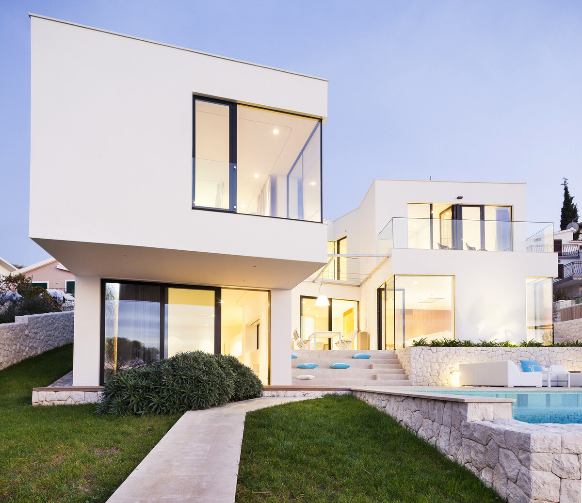 Архитектурное бюро ECOING представило проект частной резиденции B&R в курортном посёлке Севид, Хорватия. Шикарная вилла площадью 500 квадратных метров расположена на берегу моря. Она спроектирована для семьи из Бельгии в соответствии с пожеланиями клиентов и территориальными возможностями, учитывая сложных характер участка с различными высотами. Резиденция имеет U-образную форму, повёрнута к морю и открывает потрясающие виды. Она представлена двумя этажами, которые разбиты на несколько уровней. На террасе с открытой кухней спроектирован бассейн, выступающий в роли связующего элемента между интерьером и бескрайними просторами голубых вод. Все комнаты, выходящие на эту сторону, имеют панорамное остекление, в то время как другие фасады выполнены более закрытыми. От главного входа можно пройти прямо к кухне, кладовой и санузлу. Центральное двухэтажное пространство включает галереи, лестничные проёмы и столовую, которая примыкает к кухне и имеет выход на террасу с беседкой, а также переход