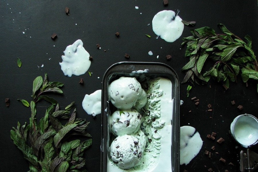 2. Соединяем сливочную основу с шоколадной крошкой и ставим мятное мороженое в морозильную камеру на 4-5 часов или до полного застывания.
