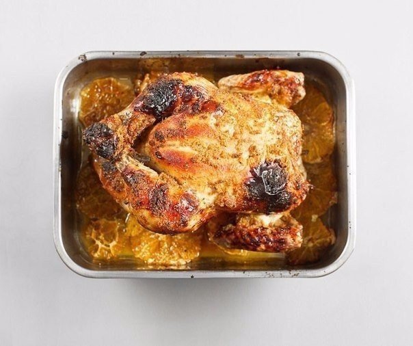 3. Духовку разогрейте до 200 °C. На дно небольшого глубокого противня или формы для выпечки выложите в один слой ломтики апельсина. Сверху грудкой вниз уложите курицу. Поставьте в духовку на 40 минут.