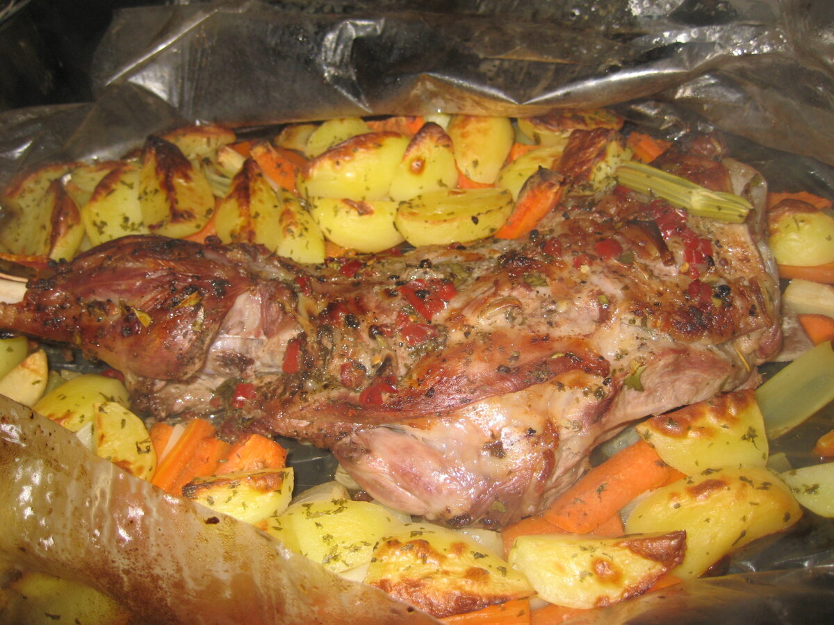Баранину может готовить не каждый, а все из-за ее специфического запаха. Но если правильно замариновать баранину перед приготовлением, то можно получить восхитительное блюдо. Для запекания хорошо подойдет рукав, так баранина быстрее запечется и ваша духовка останется чистой. А если положить вместе с бараниной овощи в рукав, то у вас получится отличный гарнир к запеченной баранине. Необходимые ингредиенты: Баранья нога или плече; Небольшая головка чеснока; Пять лавровых листьев; Чайная ложка черного перца горошком; Два острых перца; Полстакана сухого красного вина; Две столовые ложки растительного масла без запаха; Килограмм картофеля; Две крупные моркови; Две крупные луковицы; Пару черешков сельдерея; Соль по вкусу. Если на баранине слишком много жира, его надо срезать. Делаем проколы в мясе и нашпиговываем его чесноком. Перец горошком слегка измельчить в ступке или просто раздавить его скалкой. Лавровый лист надо поломать на мелкие кусочки. Натираем мясо смесью перца, лаврового листа