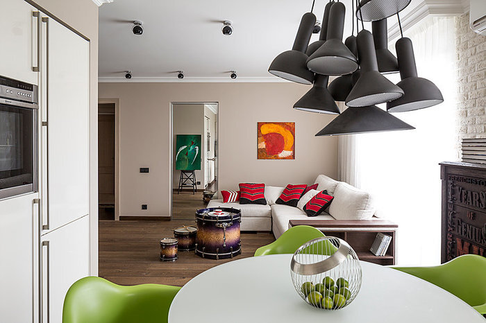 В этом маленькой трехкомнатной квартире прекрасно абсолютно все: нейтральная основа — молочный оттенок стен и полы из инженерной доски, яркий текстиль, нестандартные вещи в качестве предметов мебели (барабаны вместо журнальных столиков, небольшая стремянка как подставка для картины в гостиной) и перетекающие из комнаты в комнату мотивы: полосатый кухонный фартук и такая же стена в изголовье кровати в родительской спальне, «газетные» обои в телевизионной зоне и желтая акцентная стена в детской. А синее кресло с силуэтами ваз — это любовь с первого взгляда! Источник