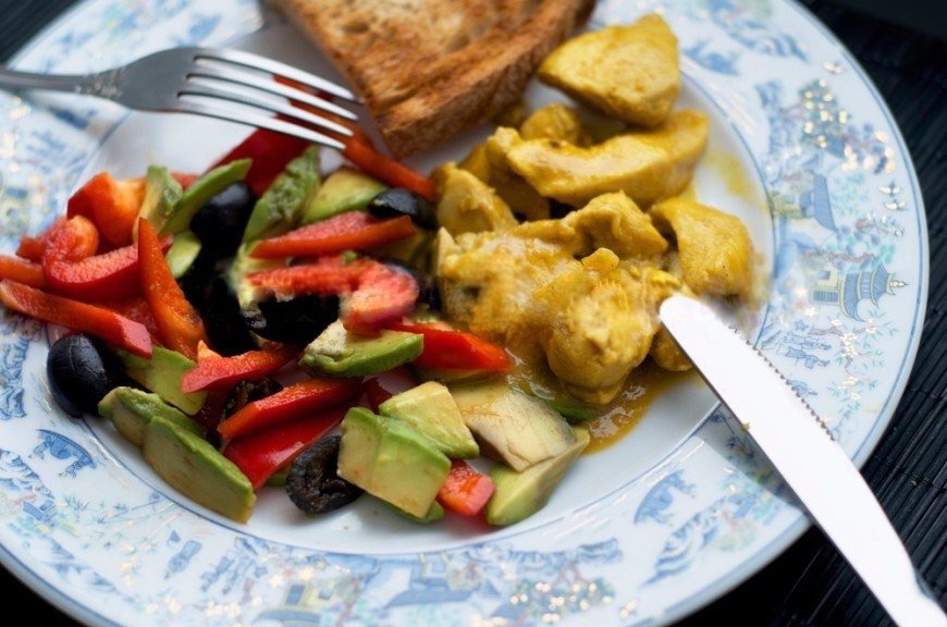1. Режем курицу на кусочки, апельсин — на тонкие дольки.
