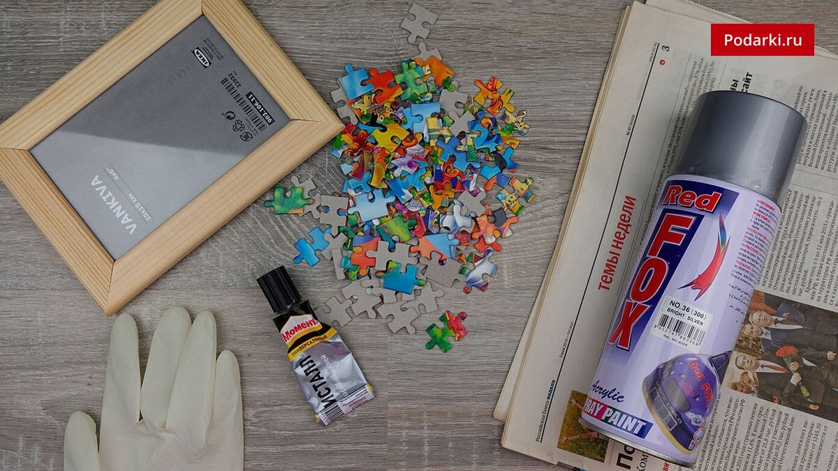 Научим делать оригинальную фоторамку из ненужных пазлов. Такая подойдёт в качестве подарка или декора 1 сентября. Красивые элементы декора можно сделать из совершенно банальных вещей, даже тех, которые мы планировали выбросить. Например, упаковка пазлов с потерянной деталью обычно летит в мусорное ведро. Смастерив симпатичную фоторамку можно подарить ей новую жизнь. Для фоторамки понадобится: - простая деревянная рамка 10х15 см; - маленькие пазлы; - клей «Момент Кристалл»; - перчатки; - баллончик серебряной аэрозольной краски; - старая газета для защиты поверхности. Шаг 1 Отделите от рамки стекло и приготовьте пазлы и клей. Шаг 2 Приклейте кусочки пазлов на рамку в 2-3 слоя. Шаг 3 Закройте поверхность старыми газетами, наденьте резиновые перчатки. Шаг 4 Покройте серебряной аэрозольной краской фоторамку в два слоя. Шаг 5 После того, как краска высохнет, вставьте фотографию под стекло. Всё готово. Просто и быстро. Если вы готовы к более сложным задачам, смотрите наши мастер-классы по со