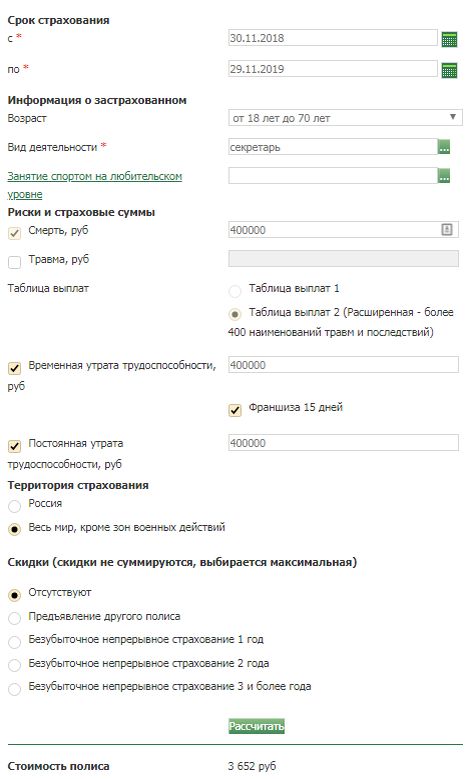 Итак, я выбрал страхование на сумму в те же 400 тыс. рублей, выбрал типичную офисную должность - секретарь, выбрал страхование на год, что бы пролонгировать раз в год на только сумму остатка долга, выбрал полное покрытие, в том числе за границей, а утрату трудоспособности - все что за пределами 15 дней (то есть срока на который мы все застрахованы государственным ОМС). Вот что получилось: