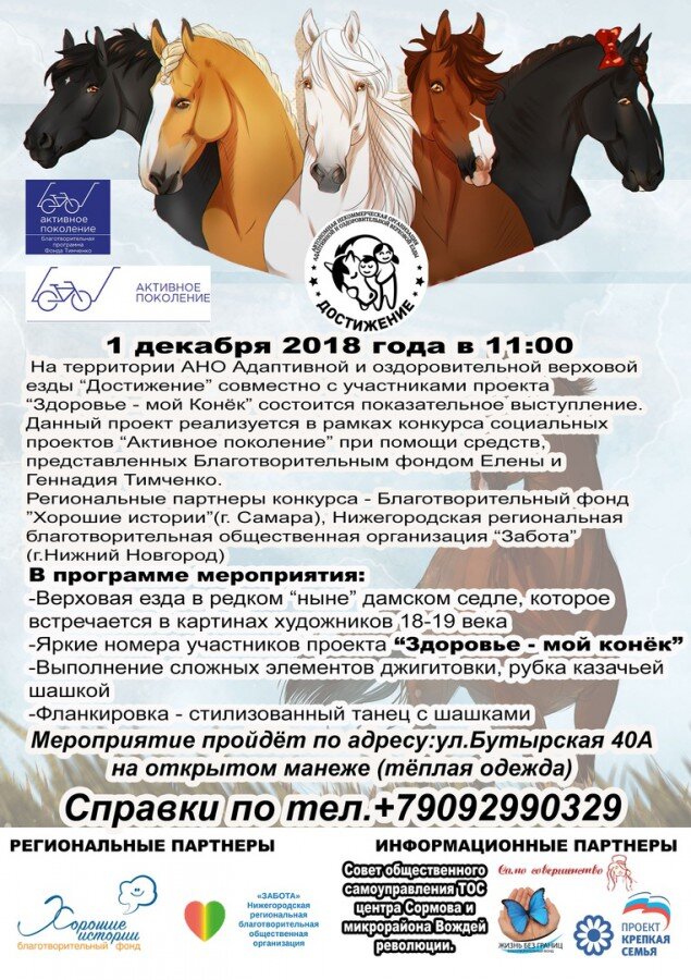 1 декабря с 111.00 в Сормово пройдет финальное показательное выступление участников социального проекта «Здоровье – мой конек». Этот проект победил в конкурсе «Активное поколение», спонсируемого Благотворительным фондом Елены и Геннадия Тимченко. Партнеры конкурса - Благотворительный фонд «Хорошие истории» и Нижегородская благотворительная общественная организация «Забота». Проект призван сделать оздоровительную езду на лошадях доступной для людей старшего поколения. 1 декабря участники проекта покажут зрителям свои умения в управлении лошадью. Зрители также увидят выступления профессиональных наездников, выездку в старинном дамском седле и сложнейшие акробатические элементы на движущейся галопом лошади. Адрес: Сормовский район, ул. Бутырская, 40 А, открытый манеж. Справка. Проект «Здоровье — мой конек» был осуществлен организациями «Достижение» и «Нижегородское Ландо». Занятия проходили под руководством профессионального тренера - реабилитолога Татьяны Г