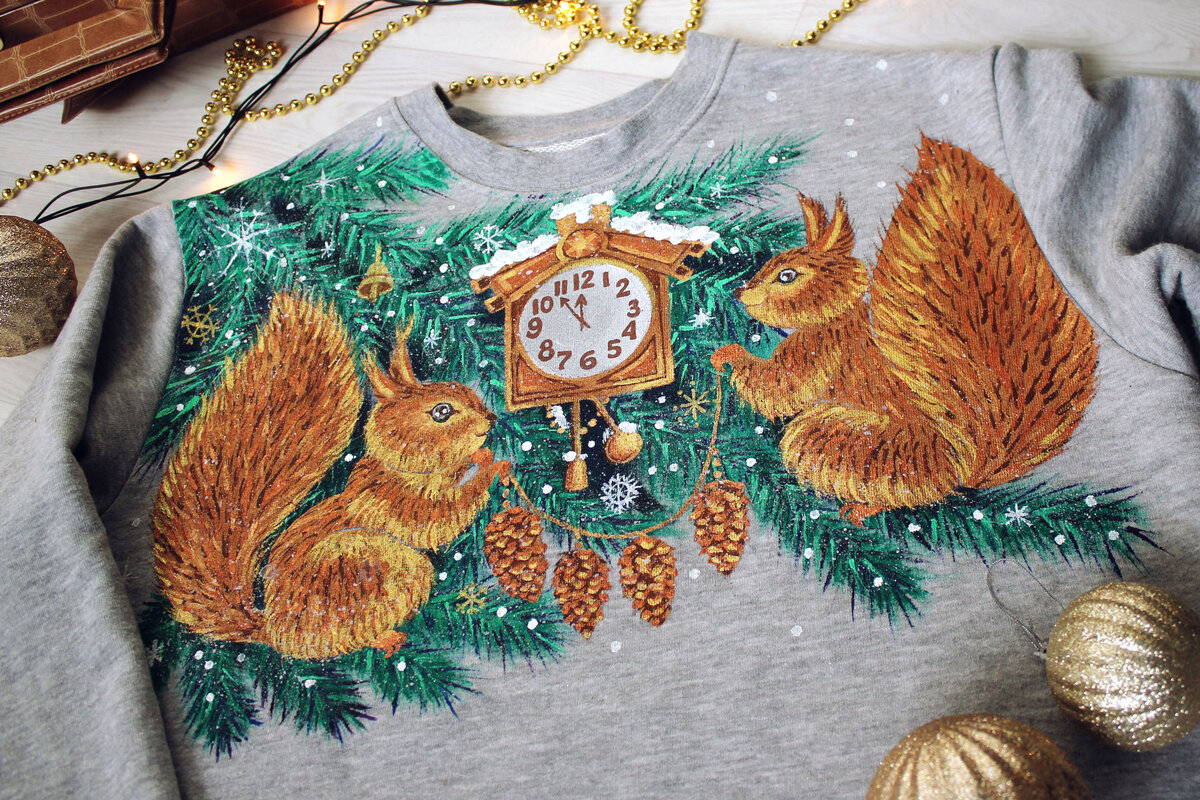 🎄Белочки на новогоднем свитшоте. Роспись одежды своими руками. 🎬 Видео ❄️